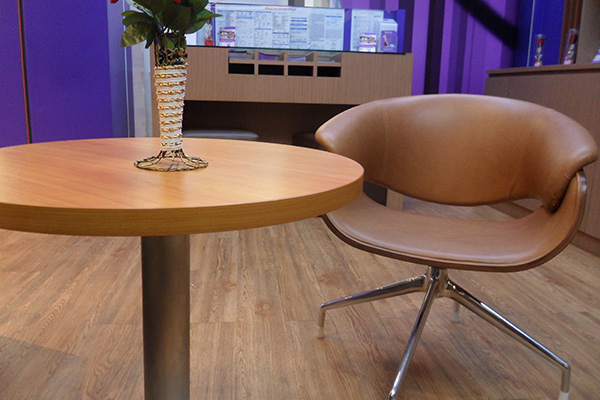 In terms of design, the purple theme color matched well with orange wood design and simple beige stone design, which makes the whole space looks simply beautiful and warm, which is in line with the design concept of a service reception hall.